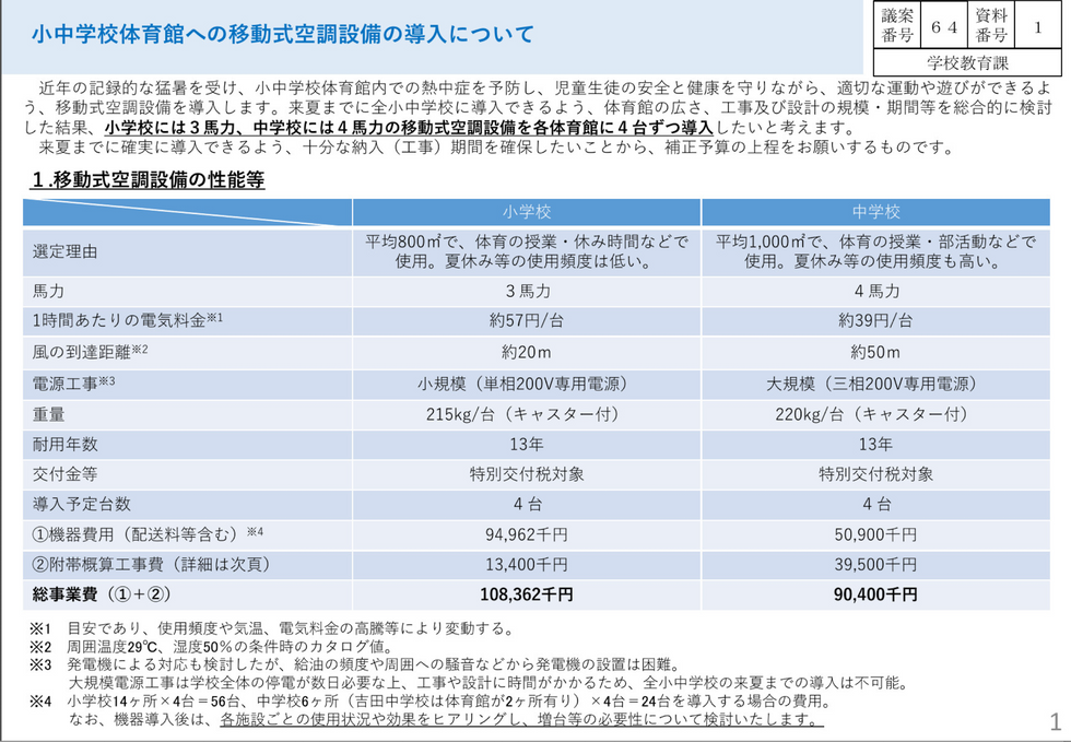 これは9月議会において私も含めて何人かの議員が小中学校の体育館での暑さ対策が必要ではないかということで質問し、その答弁の中でも導入を進めていくという話があり、実際に市役所内での判断により予算化されたものとなります。